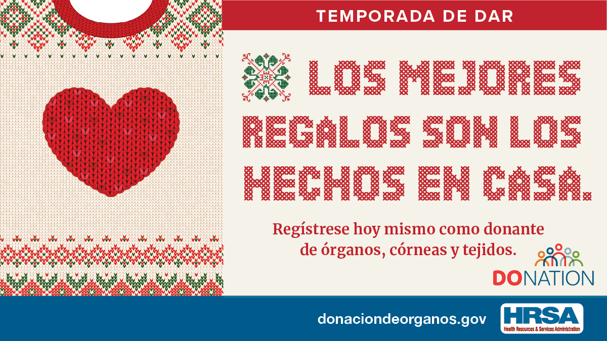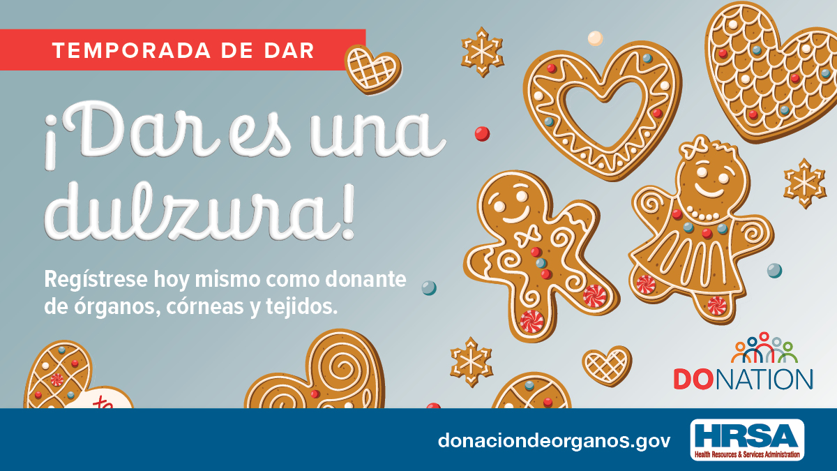 ¡Esta es la temporada para celebrar y compartir el regalo de la vida! Comparta esta serie de gráficos de temporada en español en los medios sociales o en emails para celebrar esta temporada especial para donar. Aliente a nuevos donantes de órganos, córneas y tejidos a inscribirse durante toda la temporada de fiestas.